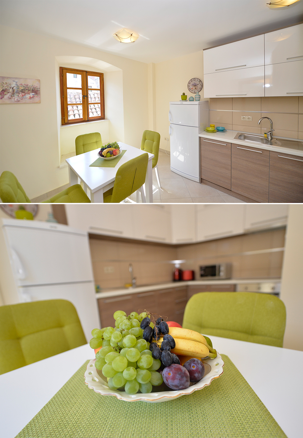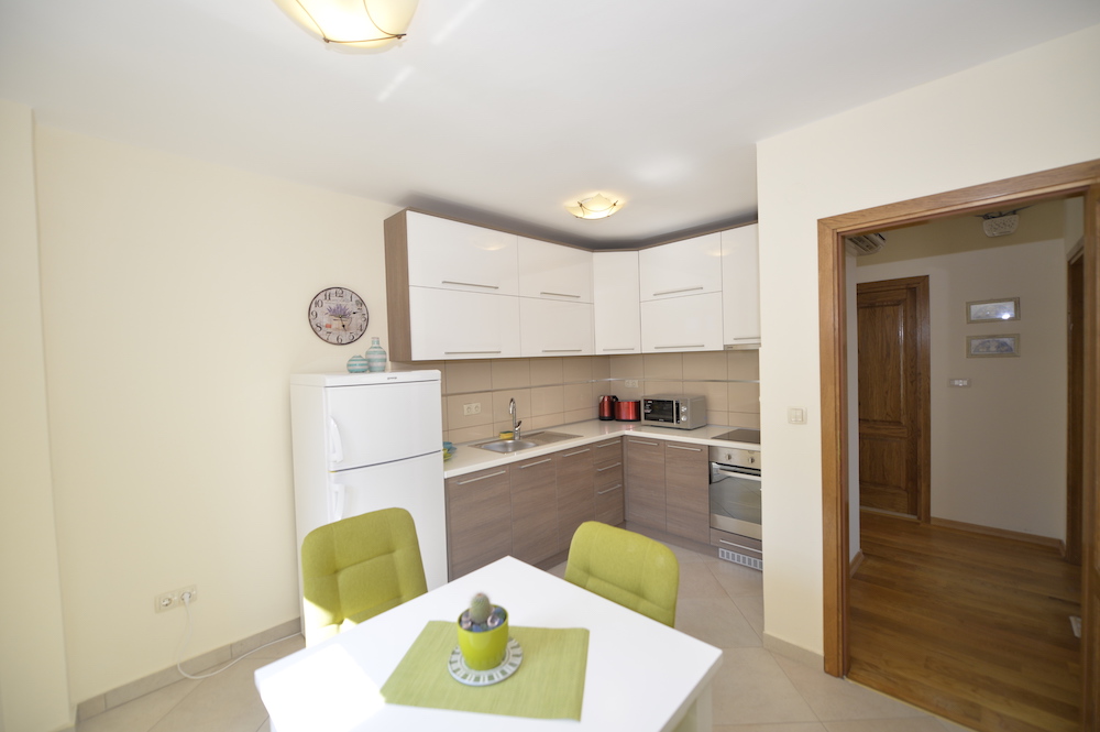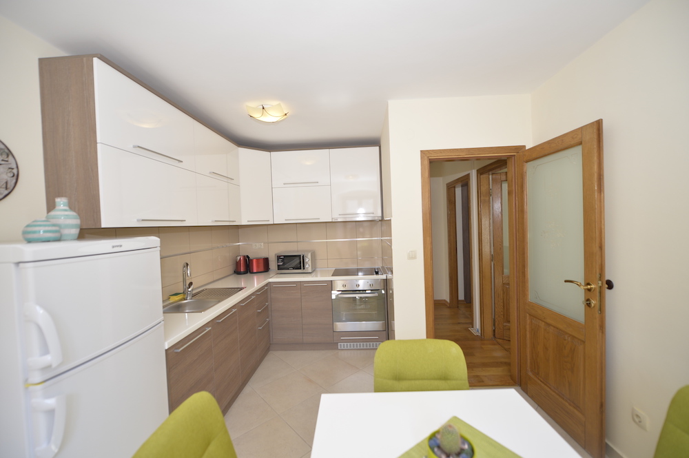 - Kuhinja: električni šporet sa rernom, frizider sa prostorom za zamrzavanje, mašina za pranje posuđa, mikrovalna pećnica, dva tostera, mikser za nes kafu, cjedilo za citruse, kuhalo za vodu, trpezarijski sto, pod je od keramičkih pločica.
