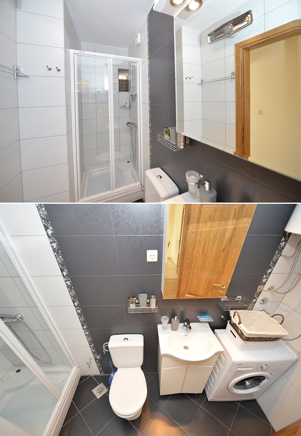 - Kupatilo: tuš kada, peškiri, fen za kosu, daska za peglanje, stalak za sušenje veša, pegla, toalet papir, mašina za veš, pod je od keramičkih pločica.
