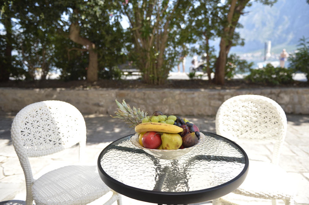 Dvorište ispred kuće sa pogledom na more i prostorom za sjedenje.