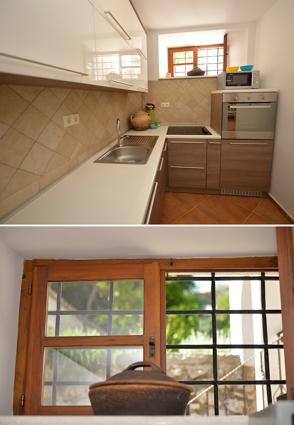 Kuhinja: električni šporet sa rernom, frizider sa prostorom za zamrzavanje, mašina za pranje posuđa, mikrovalna pećnica, dva tostera, mikser za nes kafu, cjedilo za citruse, kuhalo za vodu, pod je od keramičkih pločica.