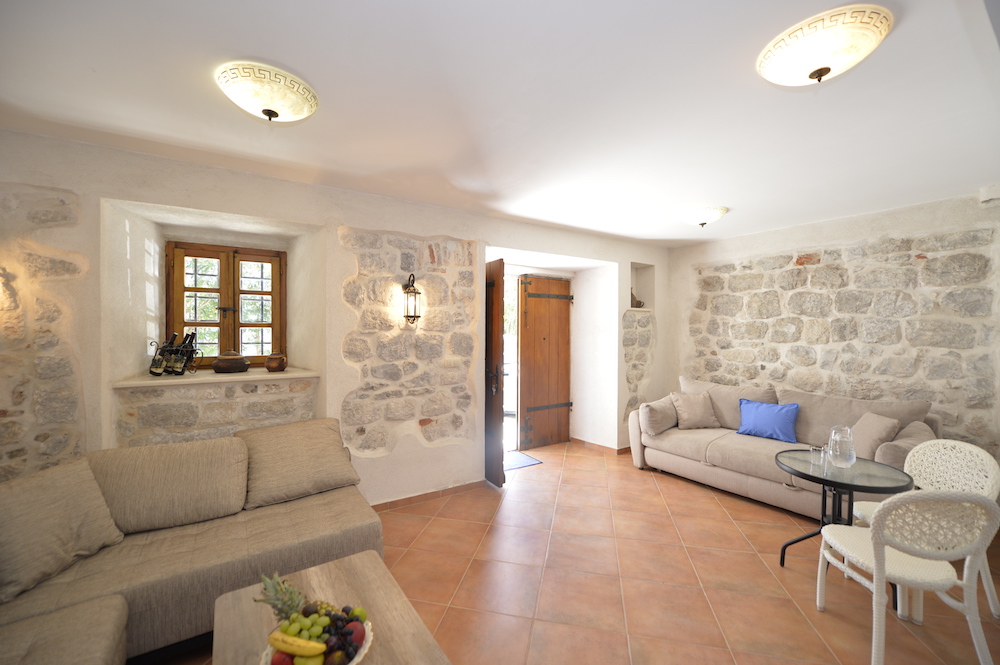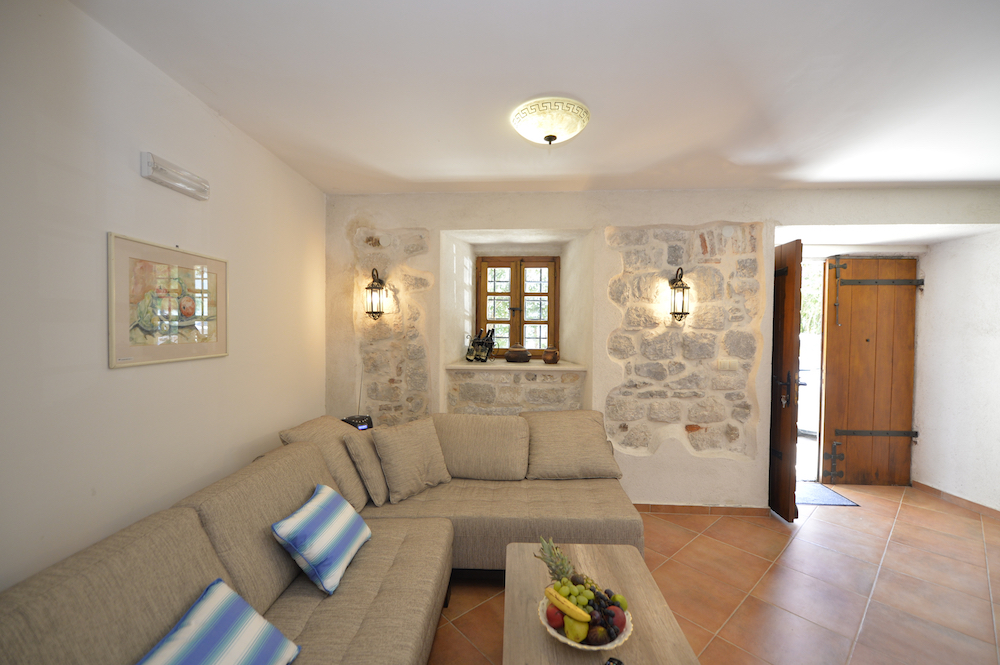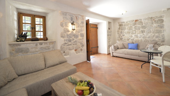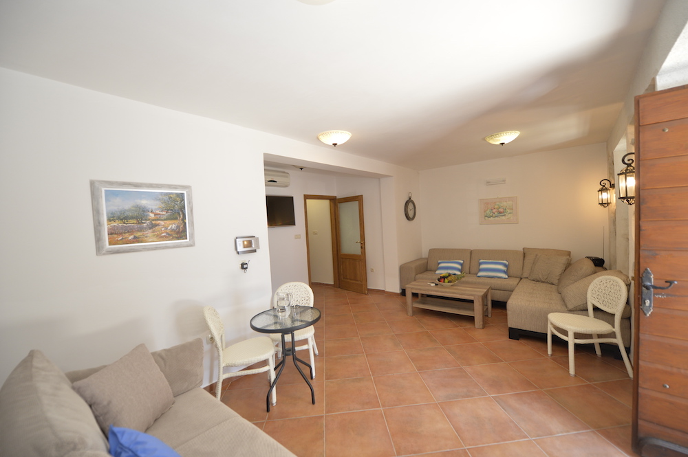 Dnevna soba: 1 ugao na razvlačenje, 1 trosijed na razvlačenje, sto za objedovanje, ormari za garderobu, čiviluk, LCD TV sa satelitskim kanalima, klima uređaj, pod je od keramičkih pločica.