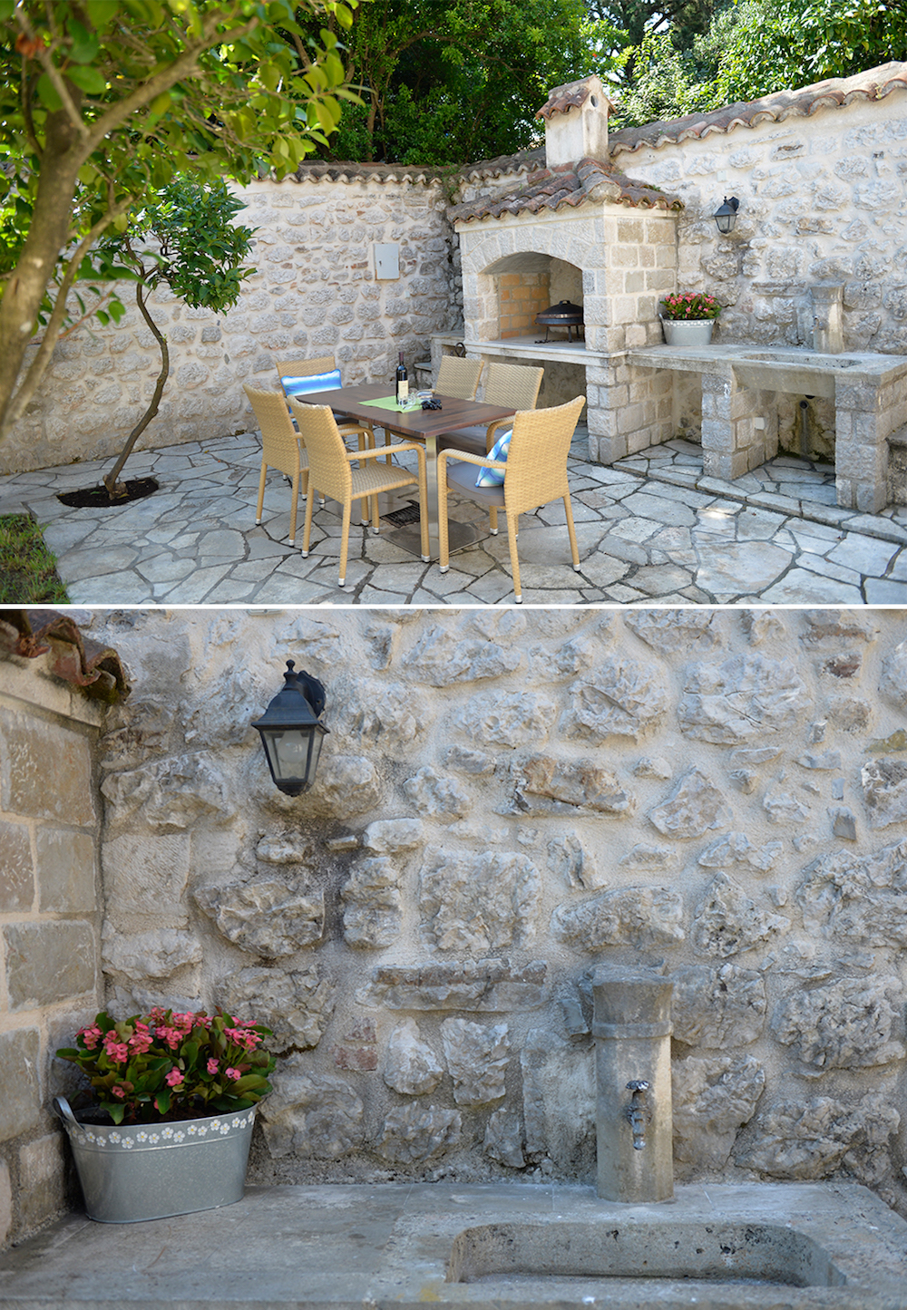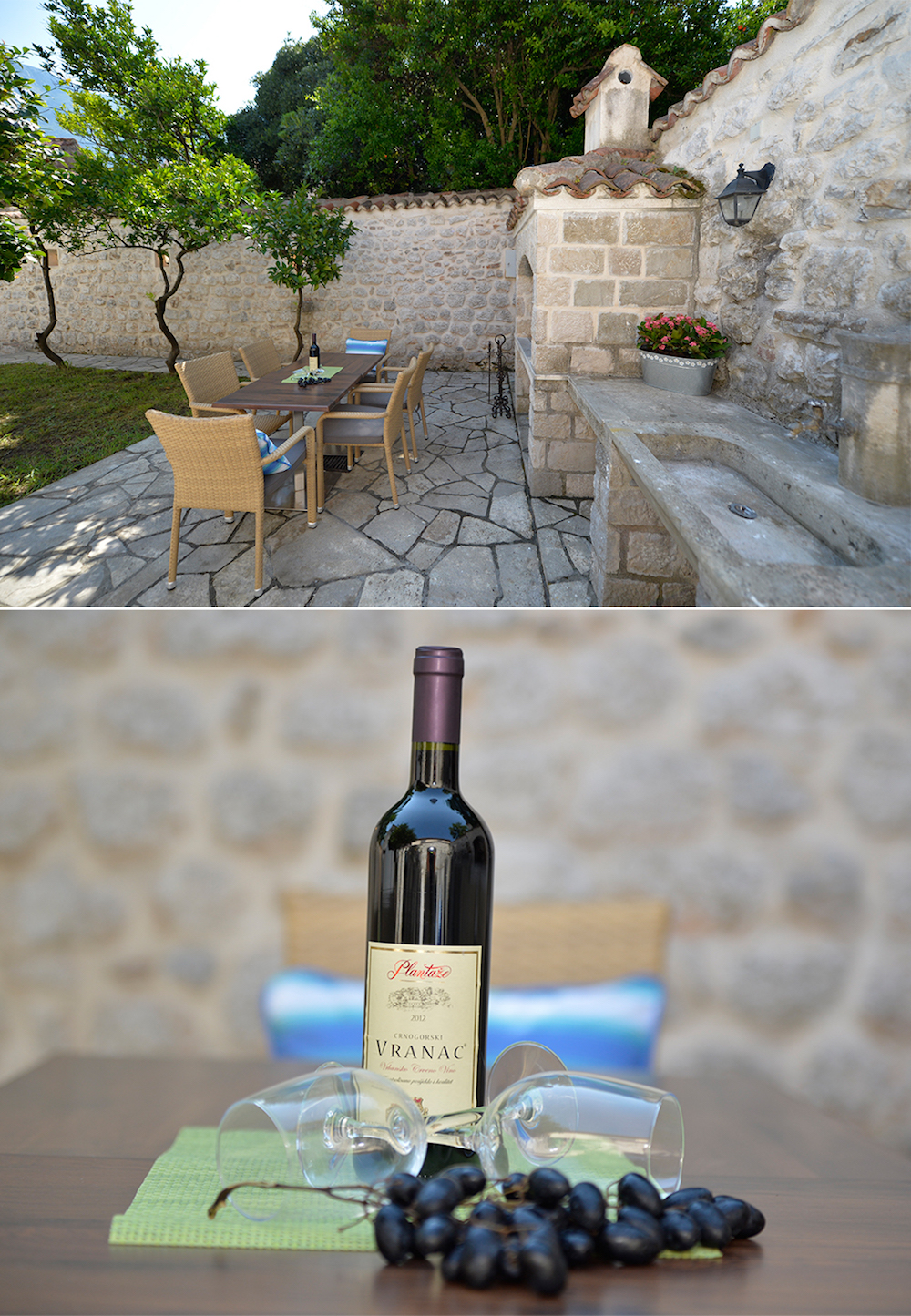 Svi apartmani posjeduju sopstvene namještene terase, zajedničko dvoriste sa priborom za roštilj, prostorom za sjedenje i sunčanje sa ležaljkama, neograniceni internet u apartmanima kao i u dvorištu, klima uređaj, dva televizora sa satelitskim kanalima, kao i kuhinju sa prostorom za objedovanje, mašinom za posuđe i svim ostalim kuhinjskim aparatima (električni šporet sa rernom, frižider sa prostorom za zamrzavanje, mikrovalnu pećnicu, dva tostera, kuhalo za vodu, cjedilo za citruse, mikser za nes kafu…) kao i svo potrebno posuđe za kuhinju.